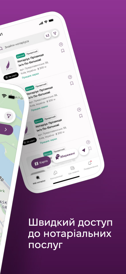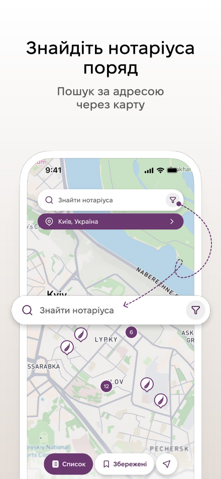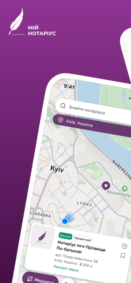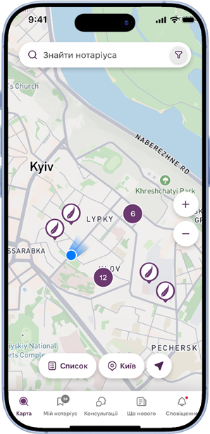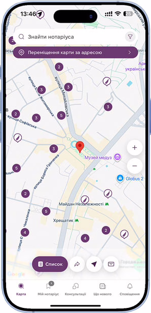 Працюємо по всій Україні з міжнародними партнерами. “Мій Нотаріус” дає потрібну зручність: відкриваєш мапу — і бачиш доступних нотаріусів саме в потрібному місці.