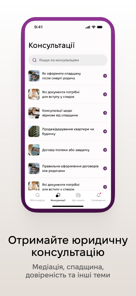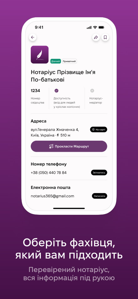 "Мій Нотаріус” показує нотаріусів на карті, актуальні контакти та графік роботи. Завдяки консультаціям одразу розумію, які документи потрібні. Це суттєво пришвидшує підготовку.